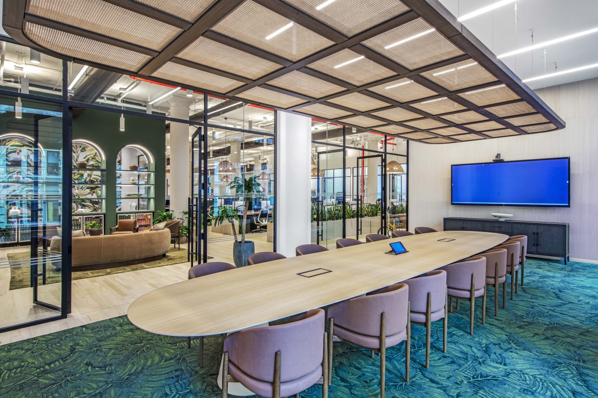 MKDA organized the conference and phone rooms into a focused zone within the workplace, balancing formal collaboration with moments of privacy. In the main boardroom, a long wood conference table sits beneath custom wood and woven cane acoustic ceiling clouds, with palm-patterned carpeting subtly reflecting Vita Coco’s brand. Beyond the boardroom, the phone rooms introduce a playful counterpoint, with bold pink interiors and tropical wallcoverings creating intimate spaces for calls and quiet focus. Custom wood signage naming meeting rooms after vacation destinations, such as Marahú and Arugam Bay, extends the brand narrative into even the smallest moments of the workplace.