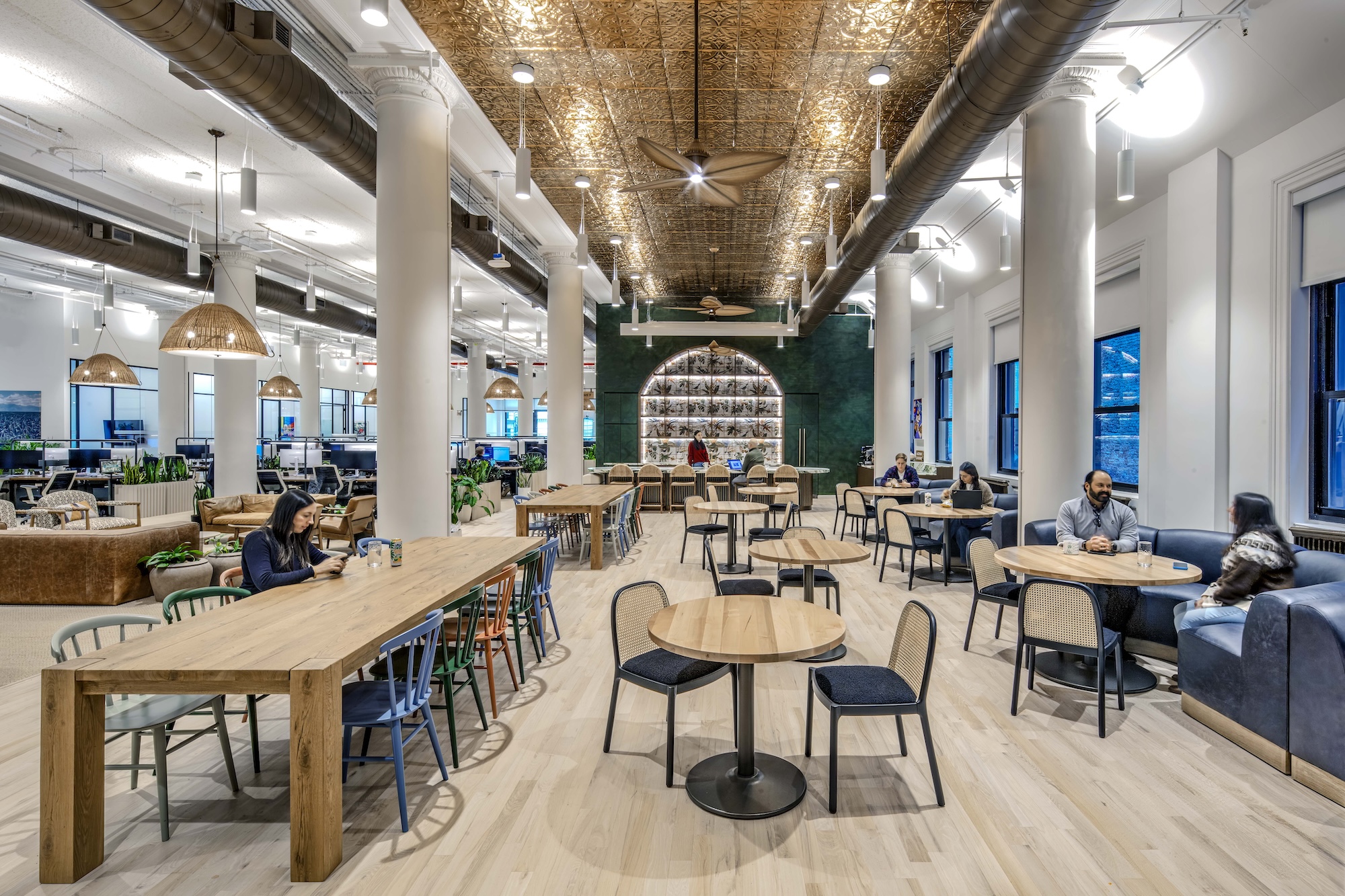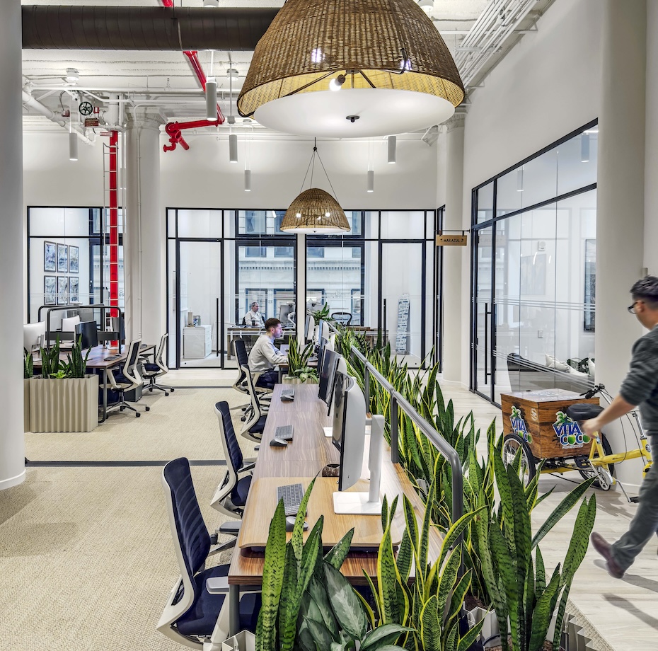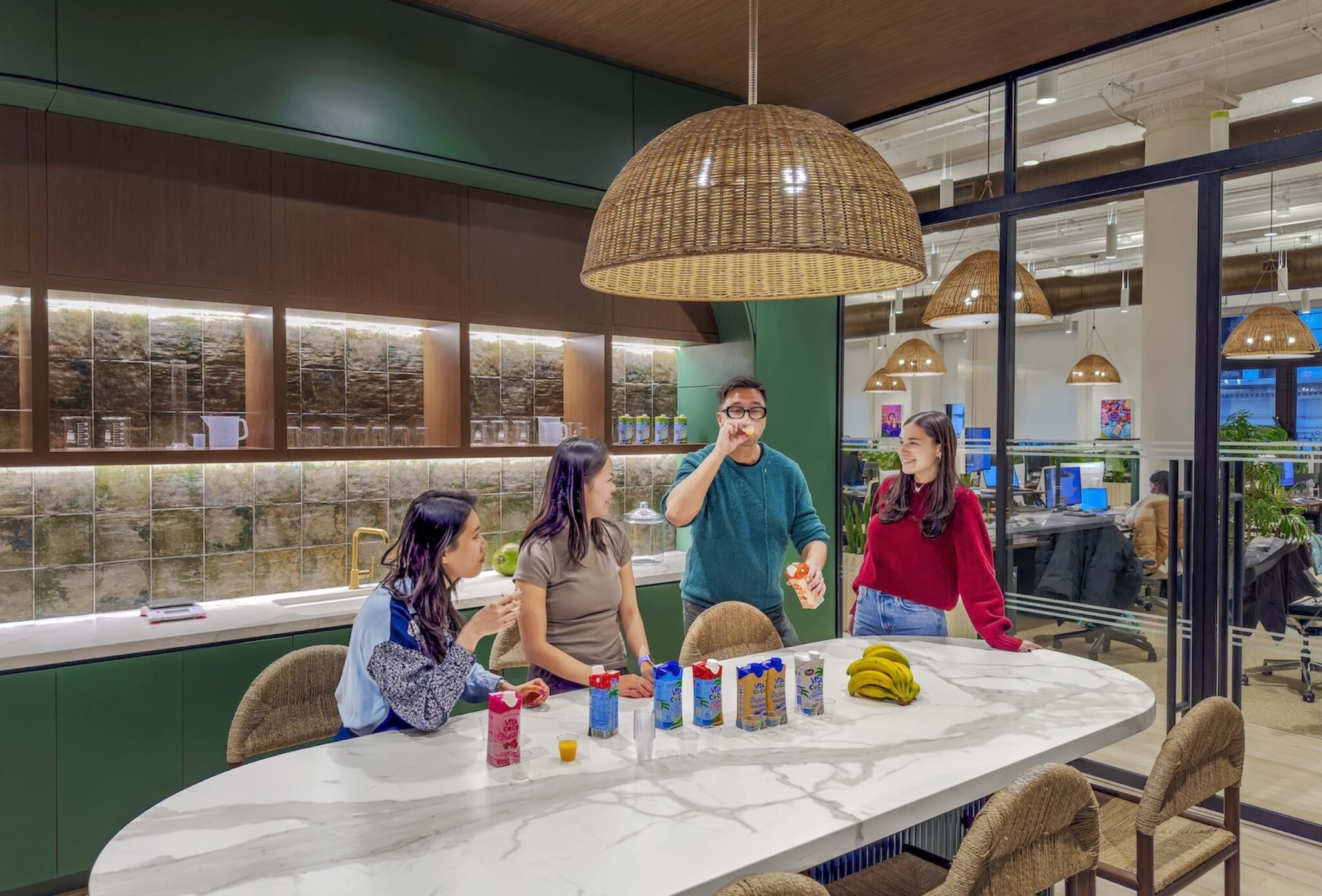 MKDA conceived Vita Coco’s workplace as a wellness-driven environment that prioritizes creativity, collaboration, and everyday efficiency. To support this vision, the design embraces a nature-driven palette of sun-washed wood, green marble, and clay and ceramic textures, establishing a relaxed, beach-inspired aesthetic. Building on this foundation, the project team layered natural materials, live greenery, and tactile elements—such as straw pendants and tropical wallcoverings—to bring the outdoors inside and reinforce wellbeing. Large windows and 16-foot ceilings flood the space with daylight, further enhancing feelings of openness and serenity. Rustic surfaces, industrial notes, and preserved building details ground the space in its urban context, balancing the softer palette with an eclectic, bohemian character.