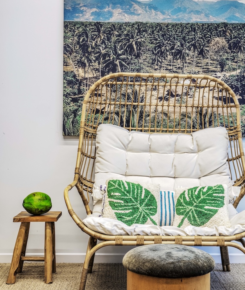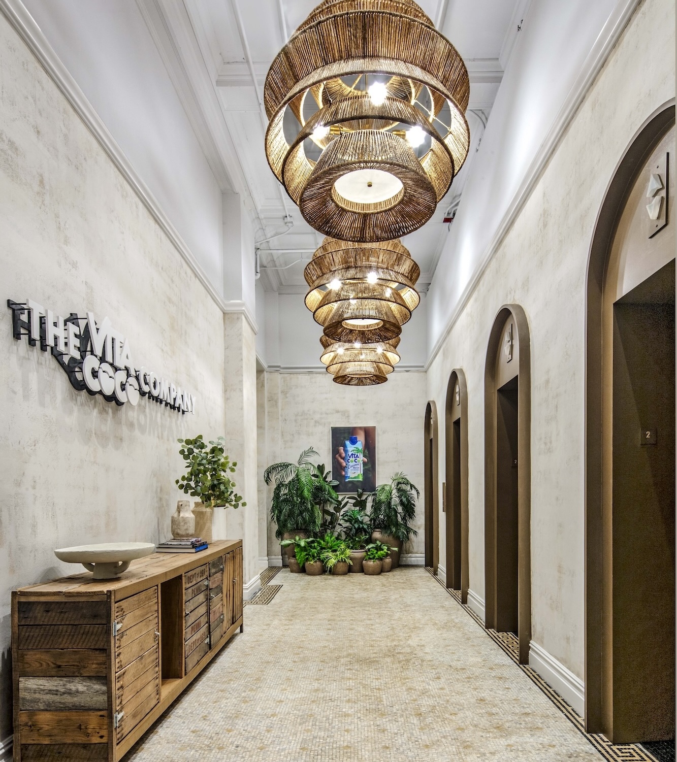 Upon entering, the elevator lobby establishes the design’s layered approach by repurposing existing mosaic flooring and incorporating custom concrete wall finishes, abundant greenery, and straw pendants. These elements pay homage to the building’s historic character while introducing a lighter, tropical-leaning tone. This transition continues into the reception area, where a deep green custom arched display wall with illuminated shelving offers glimpses of palm-patterned wallcoverings in the adjacent meeting room beyond. Notably, MKDA preserved the existing wood floors and refinished them in a bleached, sand-toned finish, while original columns with crown molding were retained throughout to maintain architectural continuity. Integrated mini refrigerators stocked with a variety of Vita Coco beverages and layered greenery complete the front-of-house experience, reinforcing a sense of hospitality and brand presence from the moment guests arrive.