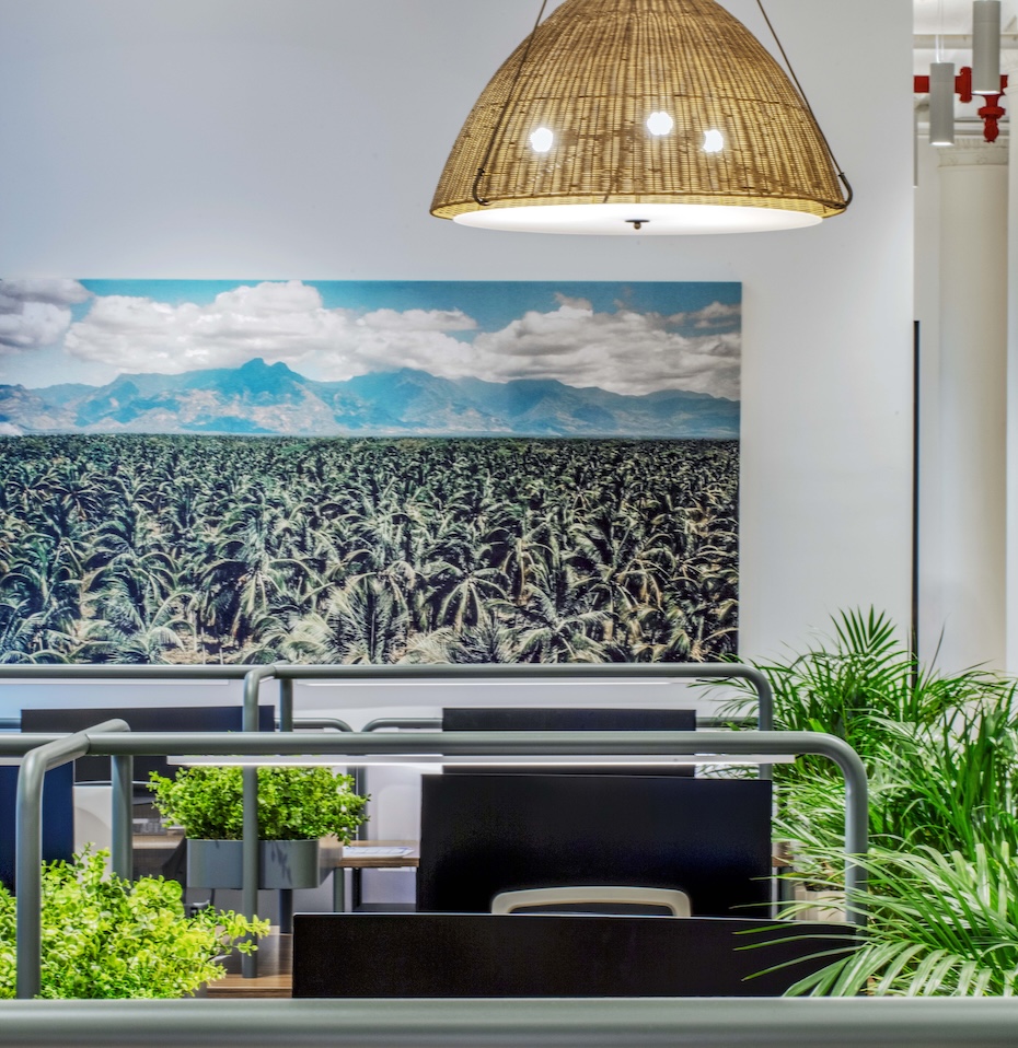 The open work area carries Vita Coco’s hospitality-driven design language into the everyday experience of work. MKDA balanced the highly efficient benching layout with abundant planters, natural light, woven carpet, straw pendants, and relaxed lounge pockets. With a program that includes 68 height-adjustable desks, executive and private offices along the perimeter, creative labs, meeting rooms, and phone rooms, the workplace supports today’s team while allowing flexibility for future growth. Ultimately, Vita Coco’s new workplace celebrates evolution, creativity, and a touch of daydreaming, blurring the line between destination and office in a way that feels as refreshing and spirited as the brand itself.